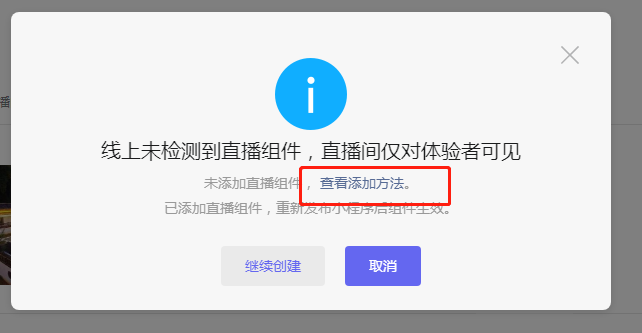 如果继续创建的话,直播间开播后分享出去的小程序码,用户扫码后显示跳转链接有误,页面不存在等信息,无法进入直播间,具体怎么解决流程?添加方法不是技术人员看不懂啊!!!!