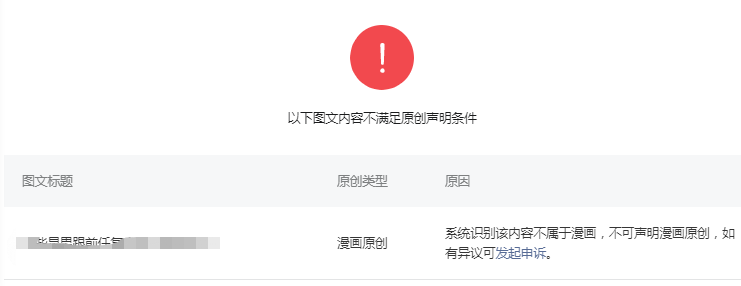 我们公众号的内容都是漫画形式,都符合原创要求,但每次标明漫画原创最后都提示不是漫画,但是每次只要一申诉就能成功,如果需要这样才能标原创的话太麻烦了,之前有过一段时间可以标原创,最近所有内容都不能标明漫画原创!希望技术同事看到帮忙解决一下~~