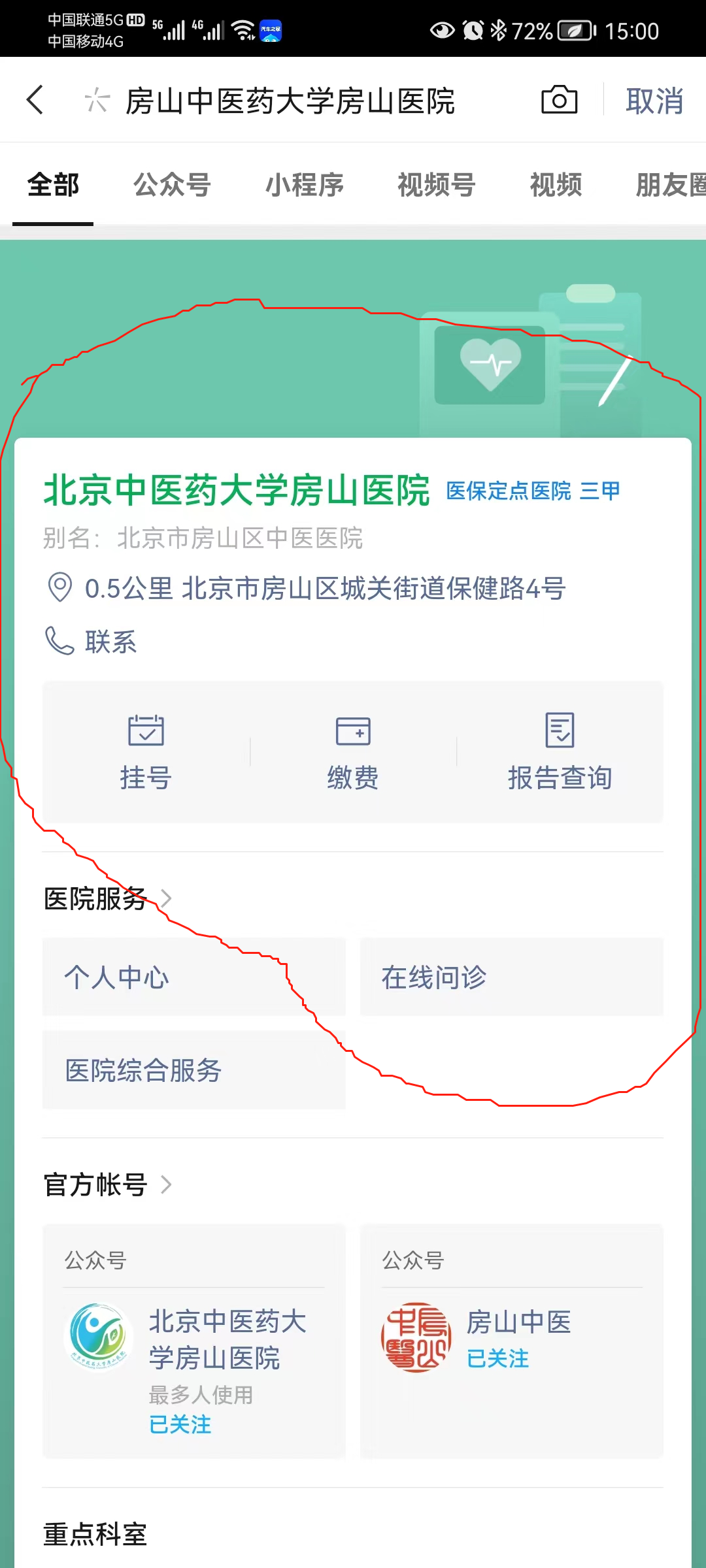 【问题描述】: 在 微信 选项卡,通过右上角的搜索按钮(放大镜)搜索 房山中医药大学房山医院 ,会显示出一个类似 公众号 的东西,名称显示我们公众号的名称,而且该公众号的挂号、交费等按钮能跳转到我们公众号的菜单连接中,我们推测为其他公众号通过搜一搜 或 号内搜索配置出来的,但不能确定,什么原因???