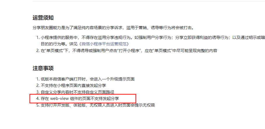参考https://developers.weixin.qq.com/miniprogram/dev/framework/open-ability/share-timeline.html#%E8%BF%90%E8%90%A5%E9%A1%BB%E7%9F%A5:~:text=%E5%AD%98%E5%9C%A8%20web%2Dview%20%E7%BB%84%E4%BB%B6%E7%9A%84%E9%A1%B5%E9%9D%A2%E4%B8%8D%E6%94%AF%E6%8C%81%E5%8F%91%E8%B5%B7%E5%88%86%E4%BA%AB