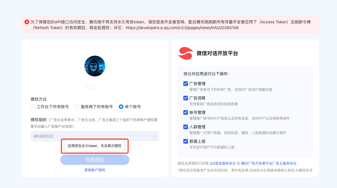我在使用微信对话开放平台时,准备新建广告标签,需要在此后台【应用绑定】>【腾讯广告】授权绑定时,在授权页提示我的广告账户无法授权,根据腾讯广告近期关于开发应用永久accesstoken的调整,猜测可能是对话开放平台在广告平台的开发应用的token 还是设置的永久token
