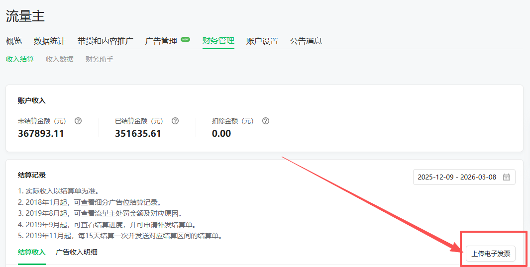 若开具的是数字化电子发票,可参考流量主无纸化结算流程:https://docs.qq.com/doc/DUGp1cEFsVmtmdEVL