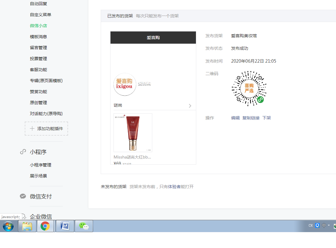 3、这个微信小店的小程序无法复制链接,点击复制链接的时候电脑屏幕左下角提示“javascript:;”(图二)