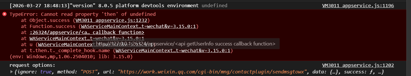 企业微信插件,在微信开发工具里调试时,会报错,但不影响实际使用,应该是内部没返回Promise就调用then了,修复一下吧