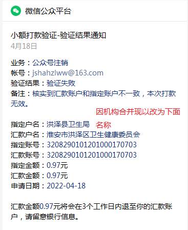 【问题描述】: 当时申请公众号时单位名称叫 洪泽县卫生局,2015、2017年机构合并现改名称为:淮安市洪泽区卫生健康委员会