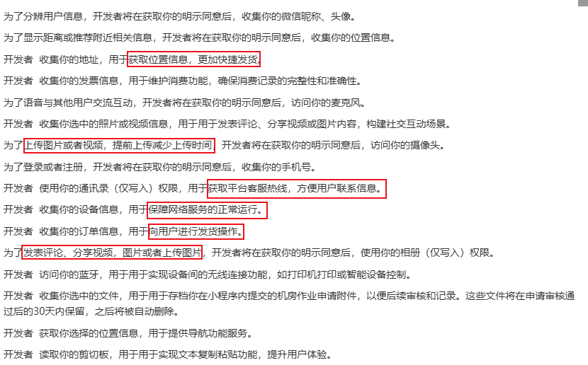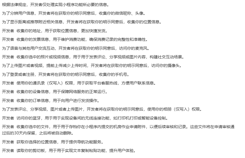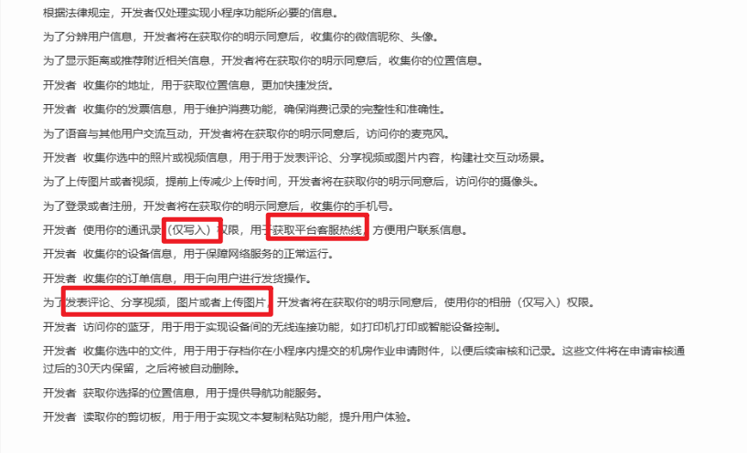 你好,建议针对不同的隐私接口分别详细描述下与其相关的具体用途后重新提交。(特别是标注仅写入相关的隐私接口含义:仅写入,无读取)