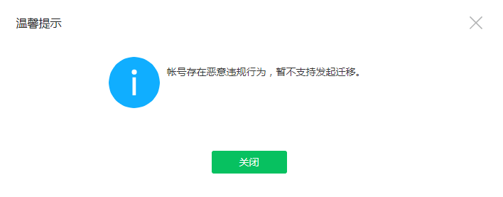 帐号存在恶意违规行为,暂不支持发起迁移”,怎么办?如何才能解除?查询后台没有违规记录 ID:gh_5ccd3f9f5639