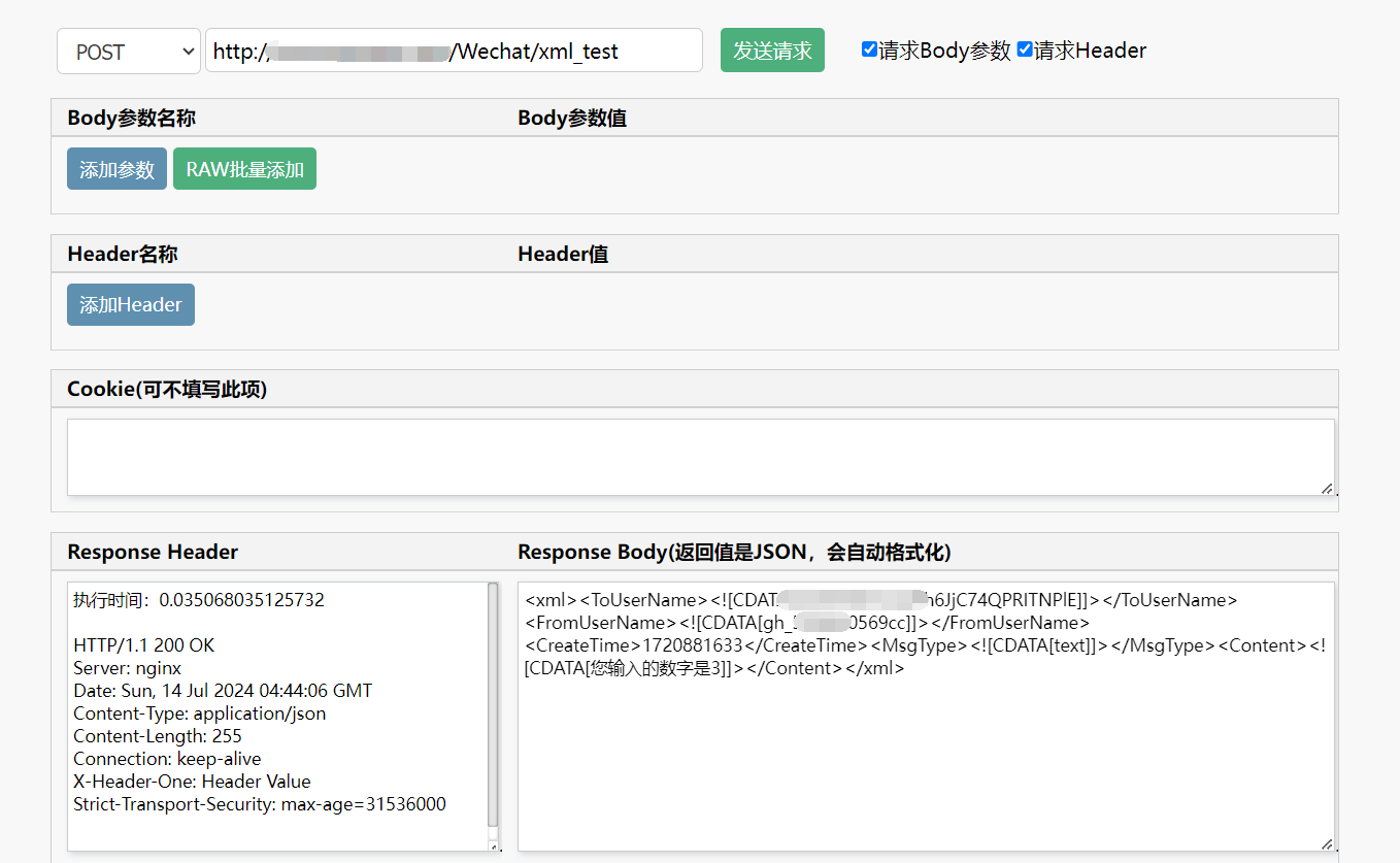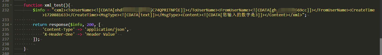 <?//定义响应header("Content-Type: text/html");//组织数据$data = array('formUserName' => 'ZhanSan','toUserName' => 'LiSi','createTime' => '2024-7-16');//使用PHP提供了SimpleXML扩展创建XML文档$element = new SimpleXMLElement()//将数据添加到XML文档foreach ($data as $key => $value) {$element->addChild($key, $value);}//输出XML文档echo $element->asXML();返回json?