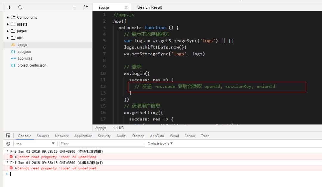 代码编译和运行中偶尔会报:Cannot read property 'code' of undefined。但是代码中出现code的地方只有一个app.js自动生成的并且在注释语句中。如下图: