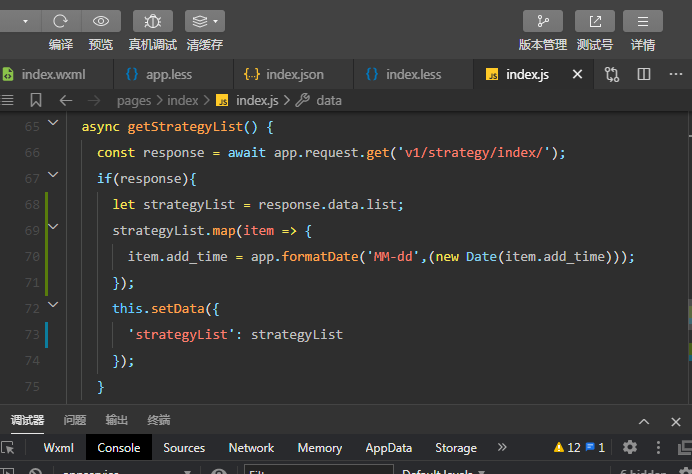 拿到数据之后先对需要格式化的数据遍历处理一下再直接放到wxml里面显示就行了,可以避过wxs这个坑。wxs用过一次之后就不想再碰了,各种不支持