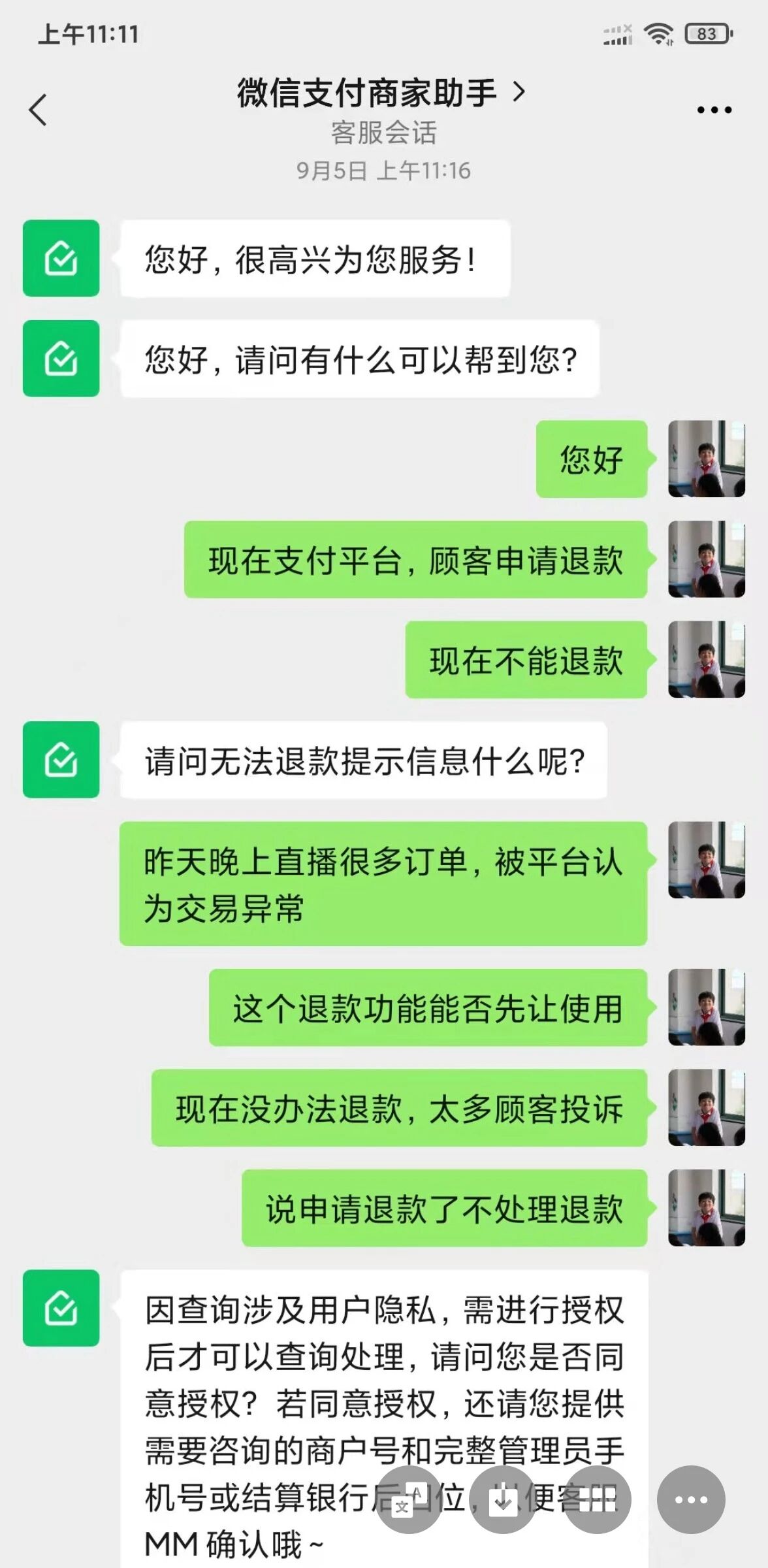 看到顾客9月5日上午联系上客服后退款功能可以正常使用后,我们将所有申请退款第一时间全部全额退还,以下截图是客服聊天记录: