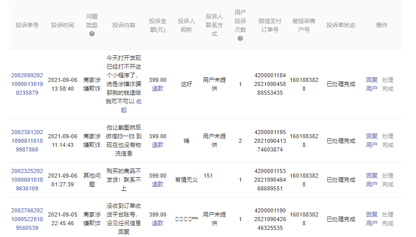 下面是顾客投诉不给退款部分截图,所有的退款我们都在9月5日中午前全部退还给用户。