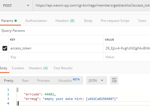 我在公众号后台往黑名单中加入了一些用户,但是调用黑名单接口(post请求),显示44002,网上搜索44002的意思是post数据为空,请问这是为什么?