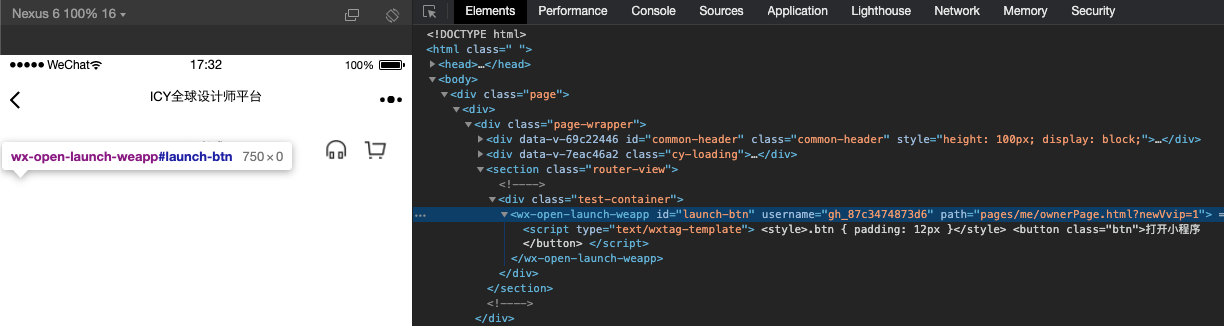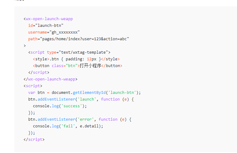 <template><div class="test-container"><wx-open-launch-weappid="launch-btn"username="gh_87c3474873d6"path="pages/me/ownerPage.html?newVvip=1"><script type="text/wxtag-template"><style>.btn {padding: 12px}</style><button class="btn">打开小程序</button></script></wx-open-launch-weapp></div></template><script type="text/babel">export default {data() {return {}},mounted() {let btn = document.getElementById('launch-btn');btn.addEventListener('launch', function (e) {console.log('success');});btn.addEventListener('error', function (e) {console.log('fail', e.detail);});this.initMiniJumperConfig();},methods: {initMiniJumperConfig(callback) {HttpRequest.post('/index.php?method=index.getWeChatSignPackage', {url: window.location.href}).then((res) => {console.log("getWeChatSignPackage result:");console.log(res);if (!res.data) {return;}this.configWx(res.data);if (callback) {callback(res.data);}}).catch(function (e) {console.log("getWeChatSignPackage error:");console.error('initMiniJumperConfig error', e);callback(null);});},configWx(wxConfig) {try {document.addEventListener('WeixinOpenTagsError', function (e) {console.error(e.detail.errMsg);});wx.config({debug: true, appId: wxConfig.appId, timestamp: wxConfig.timestamp, nonceStr: wxConfig.nonceStr, signature: wxConfig.signature,jsApiList: ['checkJsApi','chooseImage','previewImage'],openTagList: ['wx-open-launch-weapp','wx-open-launch-app'] });return true;} catch (e) {console.log(e)}return false;}}}</script><style lang="less">.test-container {width: 100%;height: 100vh;position: relative;display: flex;flex-direction: column;}</style>解决了,造成此问题的原因是: