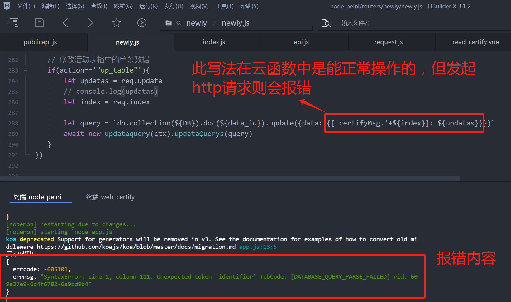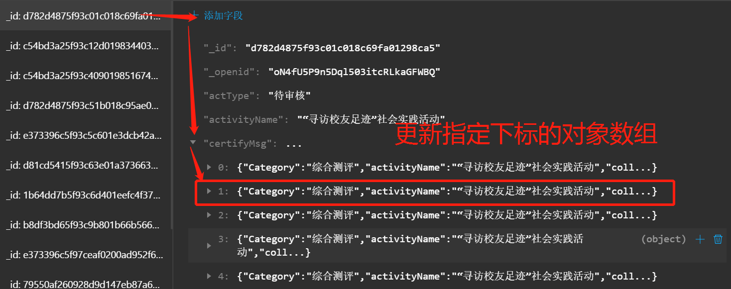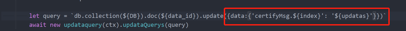 请问 let query = `db.collection(${DB}).doc(${data_id}).update({data: {['certifyMsg.'+${index}]: ${updatas}}})`中的update要如何修改?