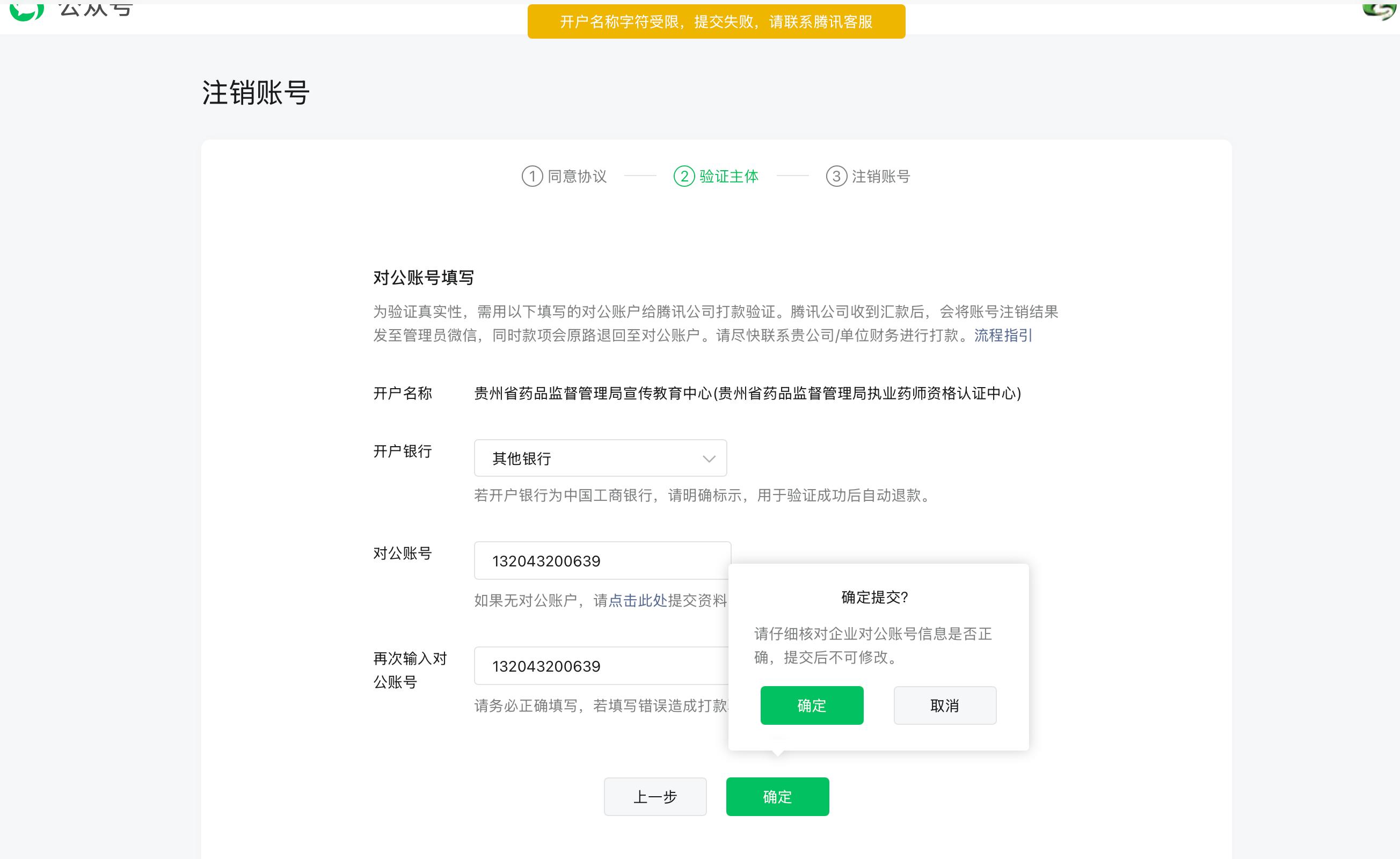 我在申请注销公众号时提示 开户名称字符受限,提交失败,请联系腾讯客服