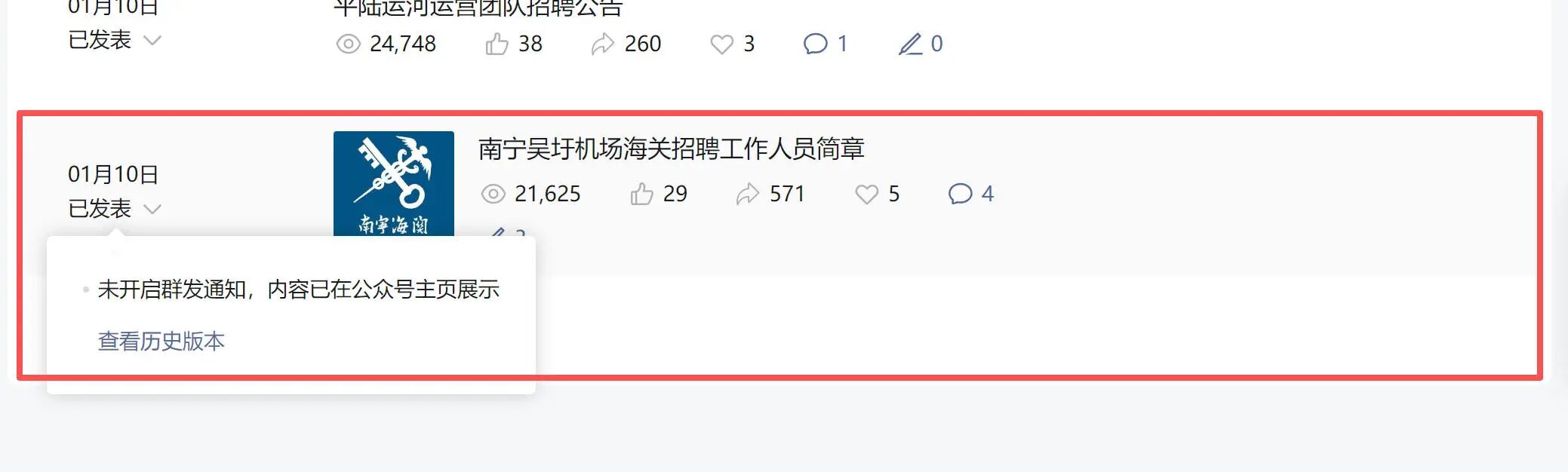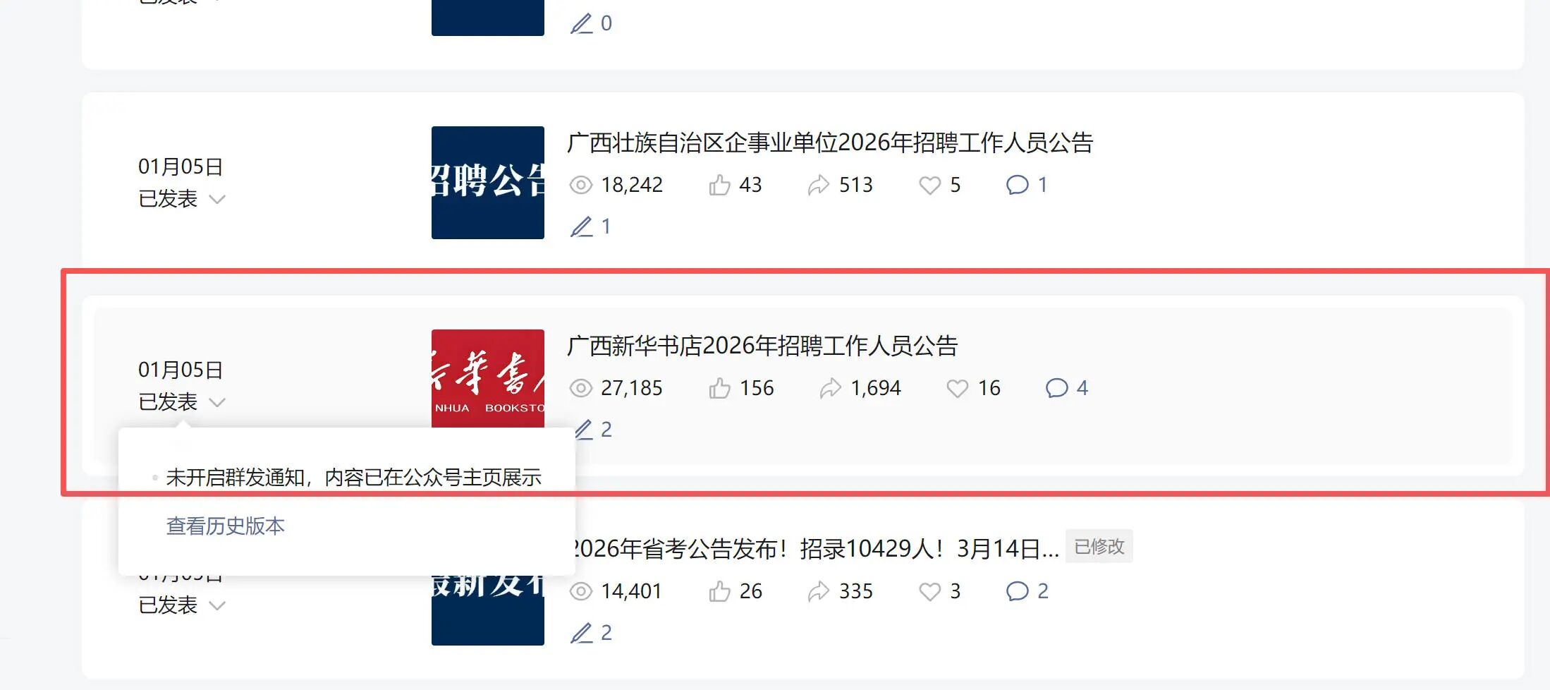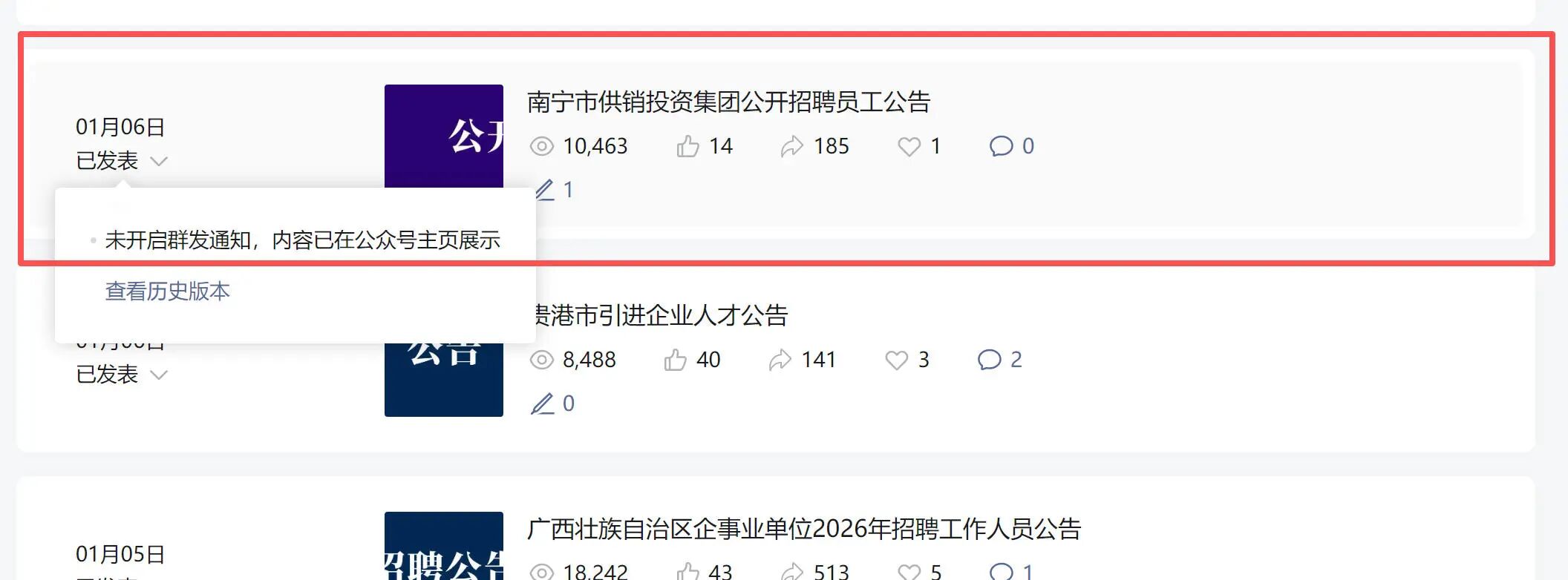 1月12日发了个非群发文章,发现文章没有在手机公众号消息弹出来,阅读上不去,就直接删掉了,没有链接只有截图。1月18日又发了一个非群发(文章链接:https://mp.weixin.qq.com/s/AfINRdrHZ7OlChxxqYSSJQ)依旧是没有在公众号消息弹出来,阅读量只有三千多左右。