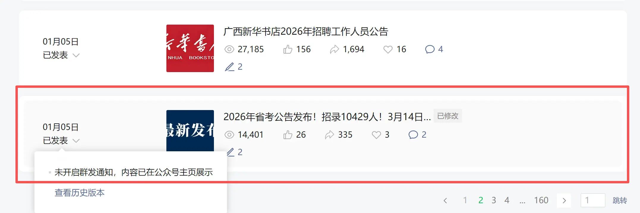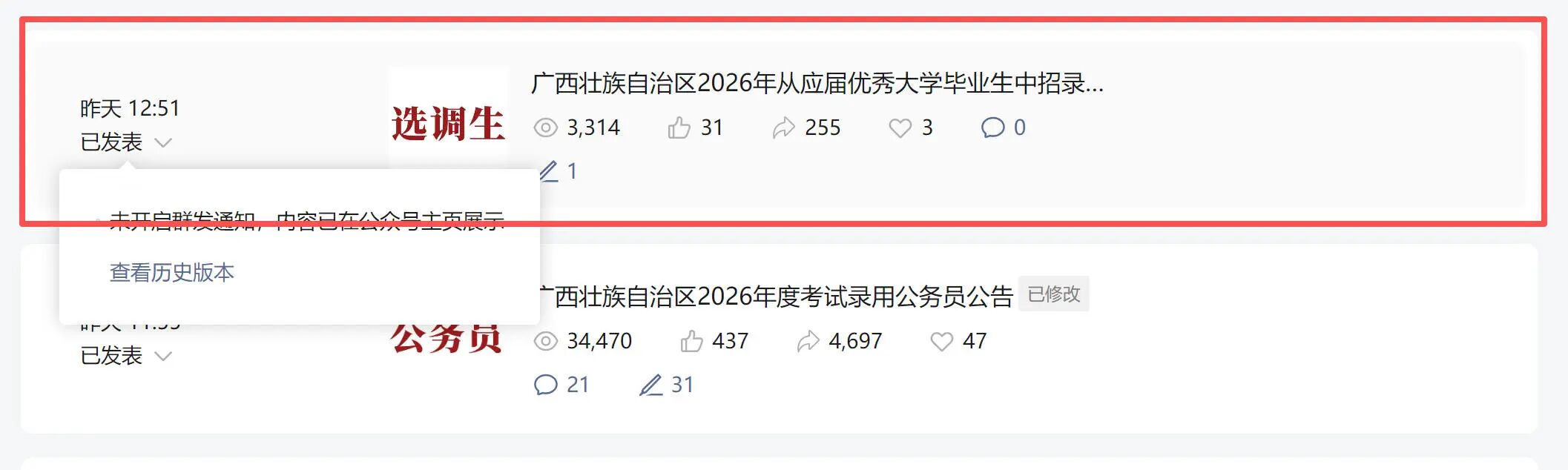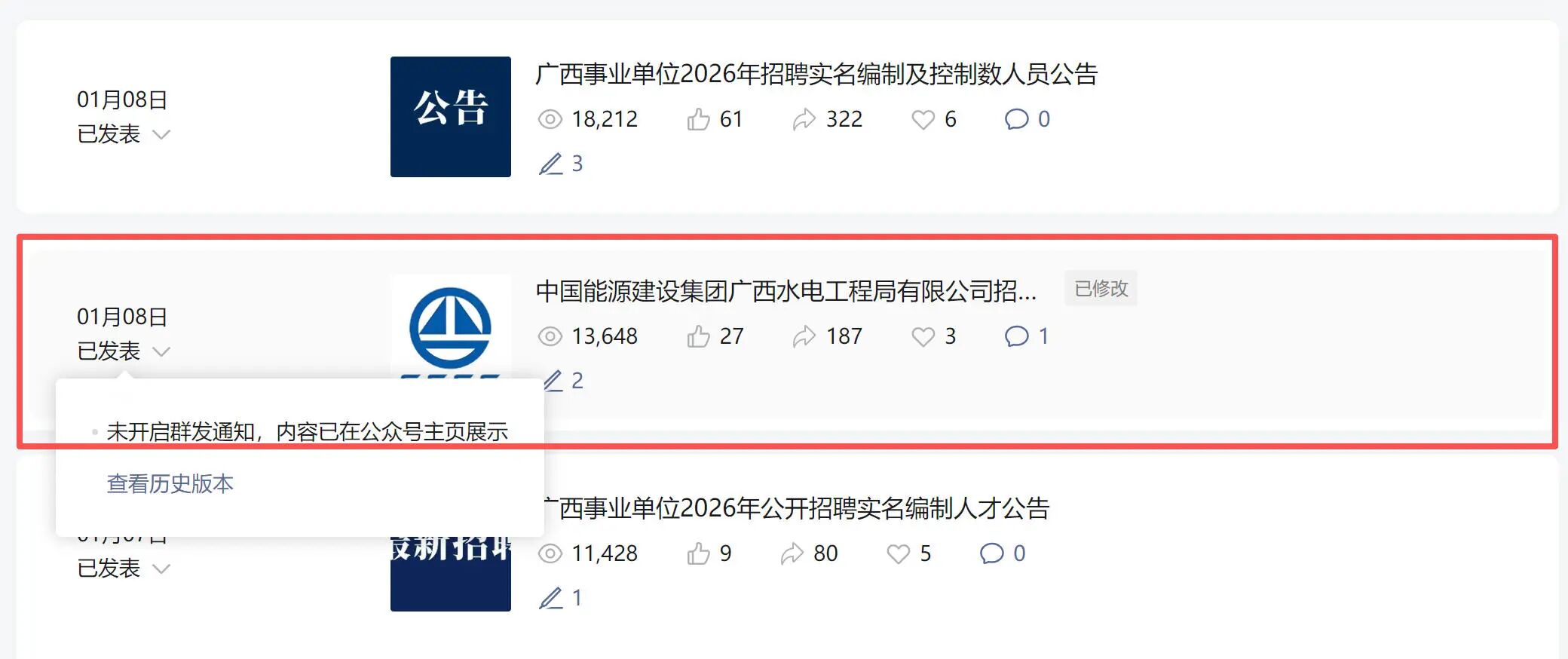 1月12日发了个非群发文章,发现文章没有在手机公众号消息弹出来,阅读上不去,就直接删掉了,没有链接只有截图。1月18日又发了一个非群发(文章链接:https://mp.weixin.qq.com/s/AfINRdrHZ7OlChxxqYSSJQ)依旧是没有在公众号消息弹出来,阅读量只有三千多左右。