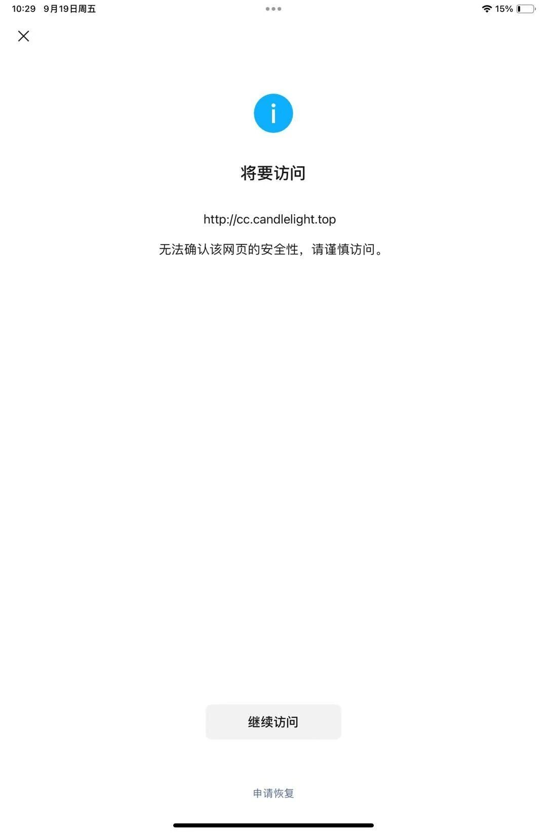 我的服务号网页http://cc.candlelight.top,在微信中打开提示"无法确认该网页的安全性,请谨慎访问"。域名备案正常,浏览器访问正常,网页里没有不安全的内容,腾讯安全-网址安全中心检测也没有发现风险,请核实后帮忙解除拦截,万分感谢!
