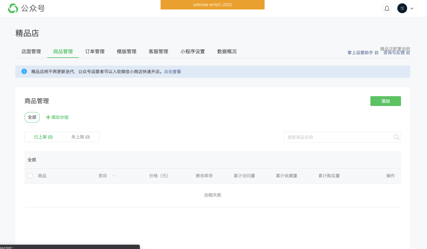 搜一搜—微信圈子—精品店——店面管理,在商品管理一直加载失败,显示不了商品页面,提醒 unknown error(-202)
