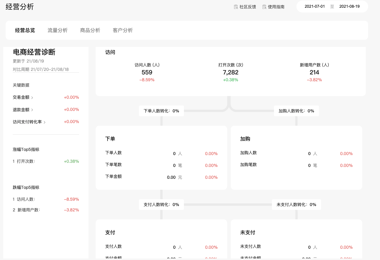 我们已经完成了经营分析的接入,都有实时数据了,但是下方的统计以及商品分析、客户分析的统计均还是没有数据,是不是必须要发布正式代码才会有数据统计呢?如下面的截图