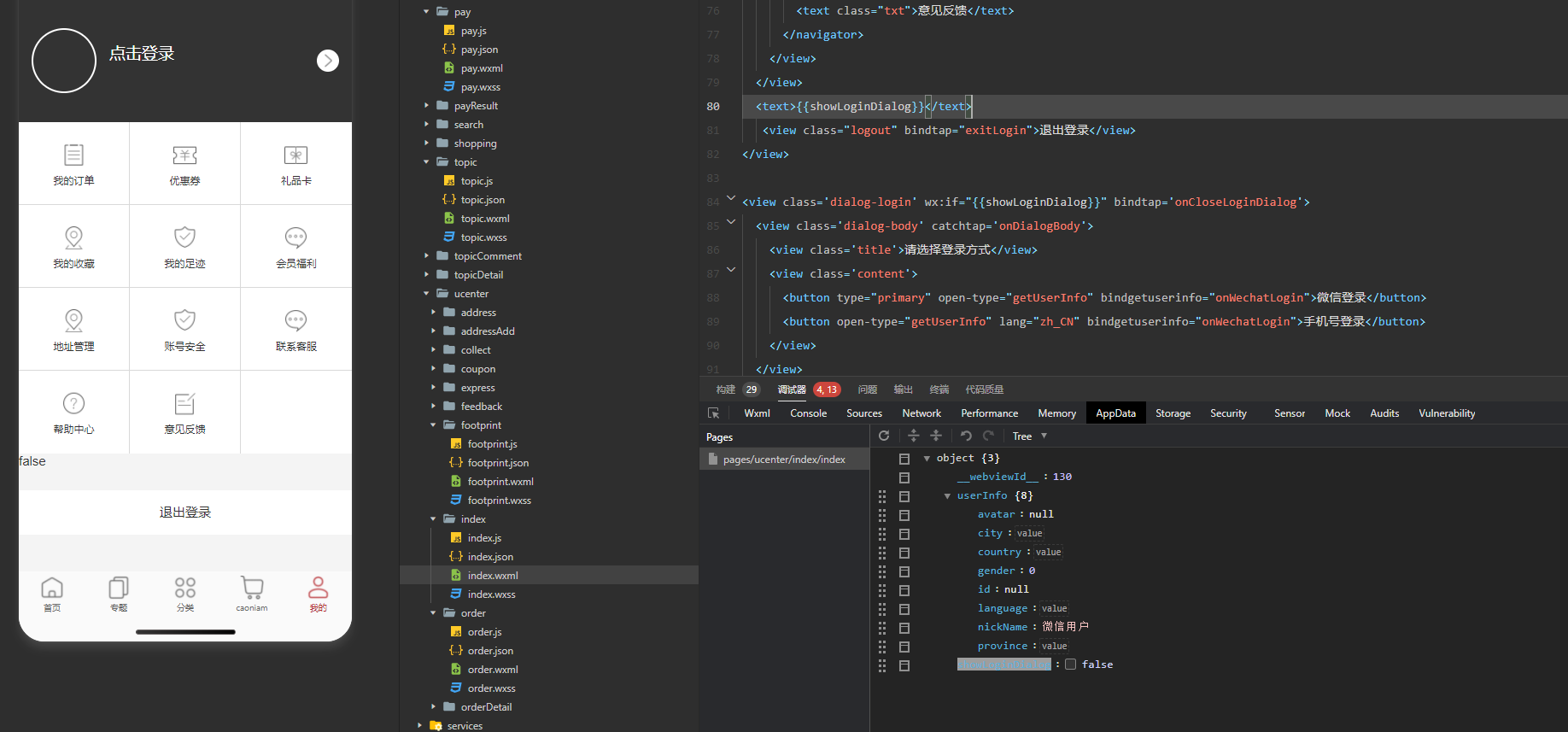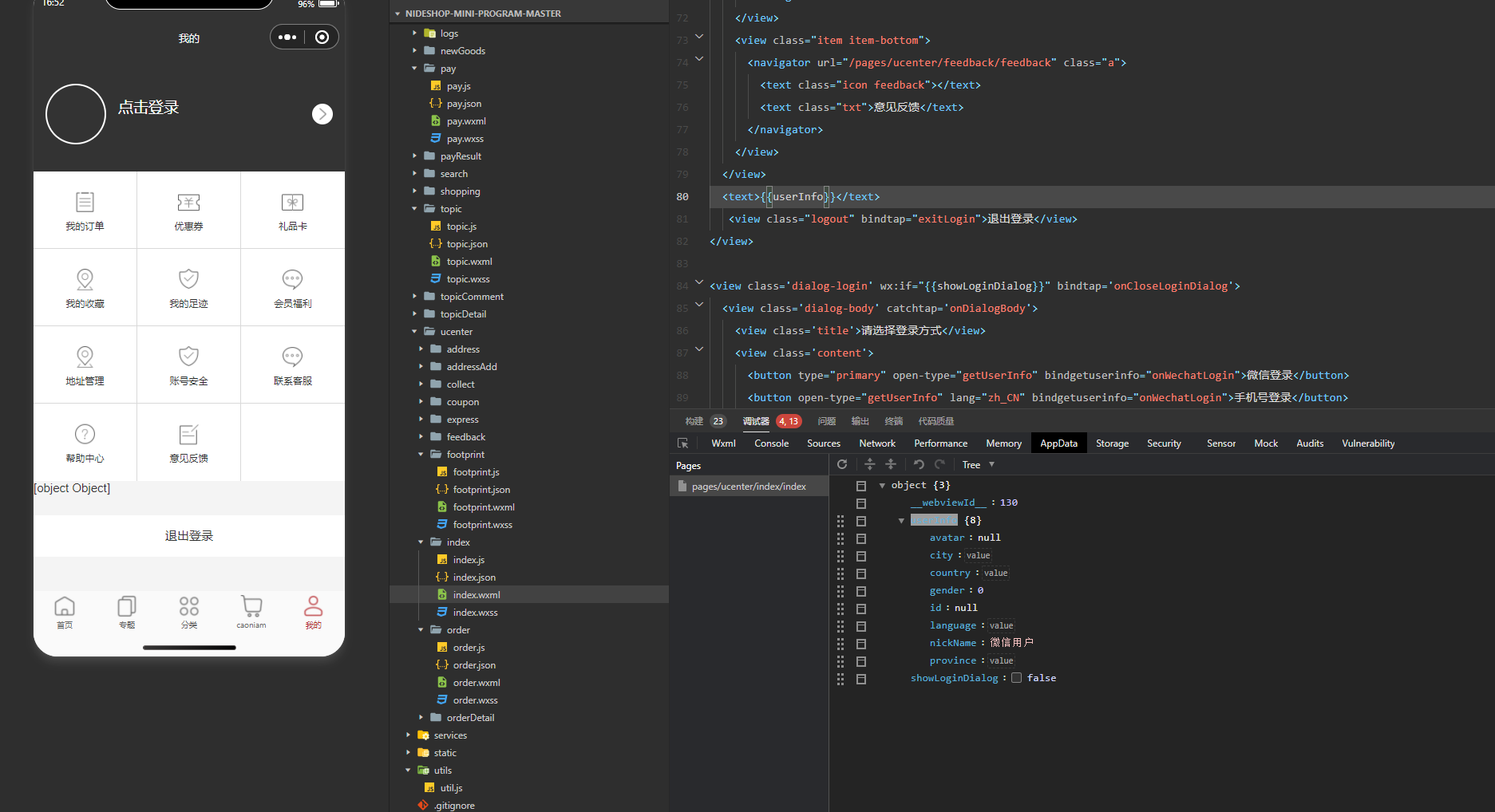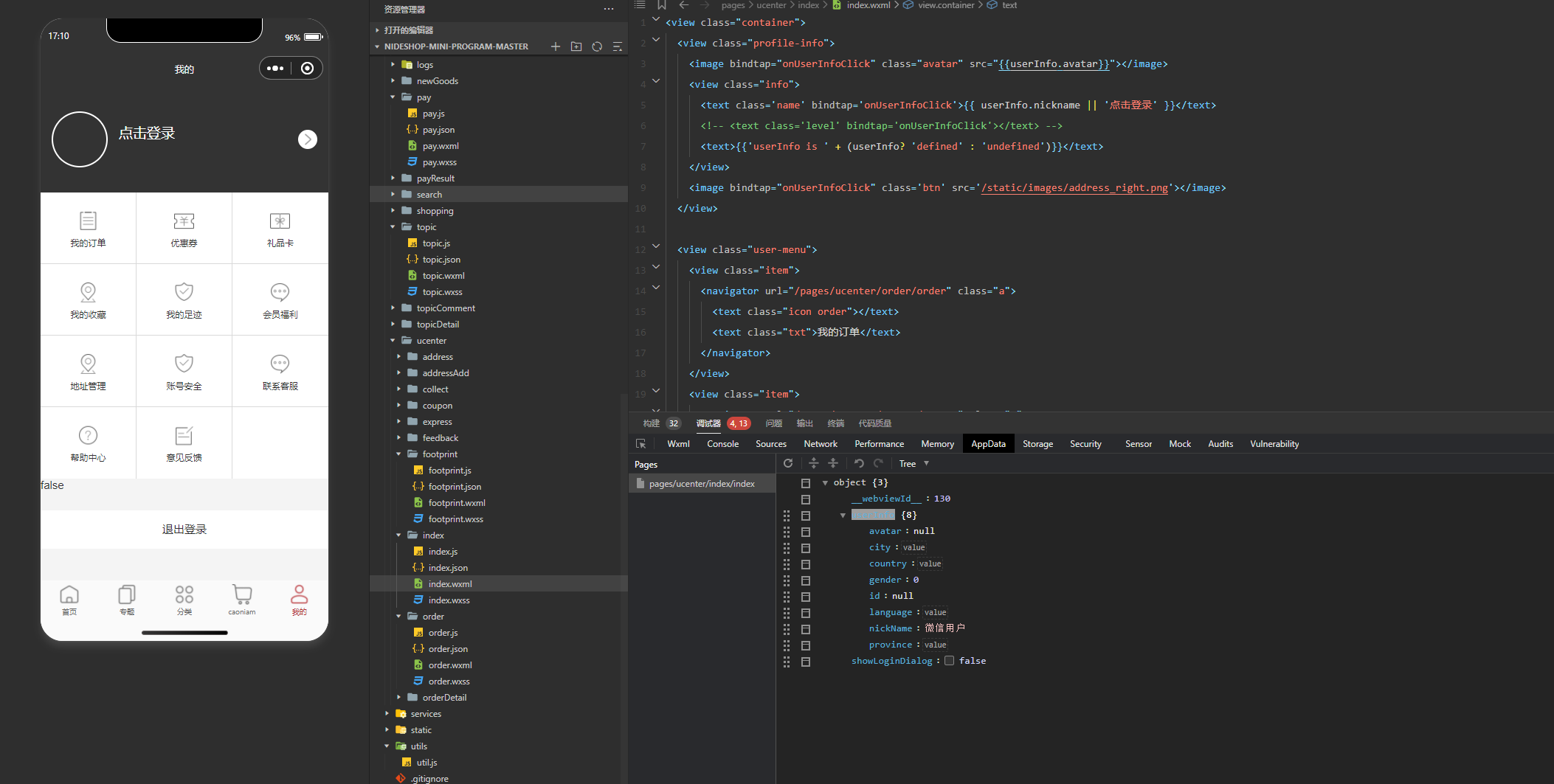 这是js代码。控制台打印appdata中的userifno可以显示出来,就是在wxml获取的的时候获取不出来,这是为什么,有大神能帮忙解决一下吗