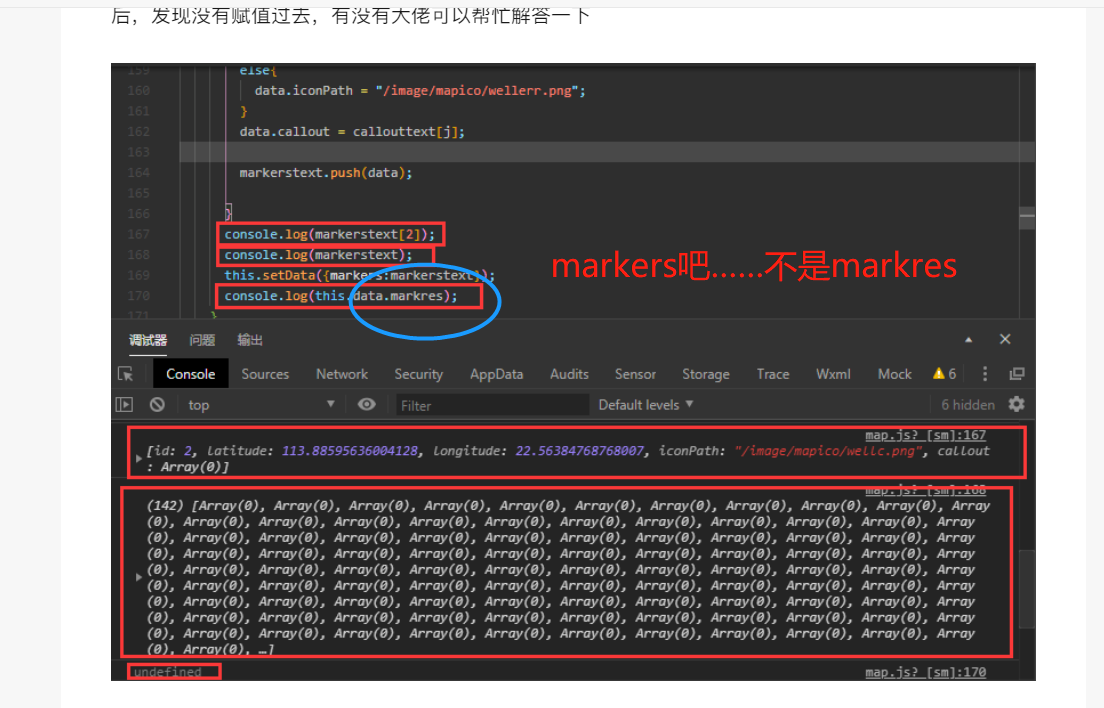 map组件想动态调整markers的内容,就用了push来组装一个给markers的数组,但是使用setdata赋值后,发现没有赋值过去,有没有大佬可以帮忙解答一下