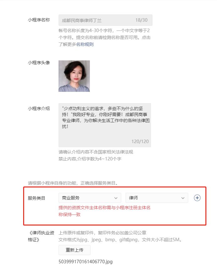 你好,经核实,贵方小程序的注册主体为冯青竹,和提供的《律师执业资格证》上的持证人:丁兰,不一致,所以审核被驳回,请提供主体一致的资质。