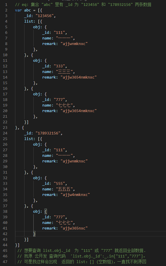 // 我原 云开发 查询代码 'list.obj._id':_.in["111","777"]。