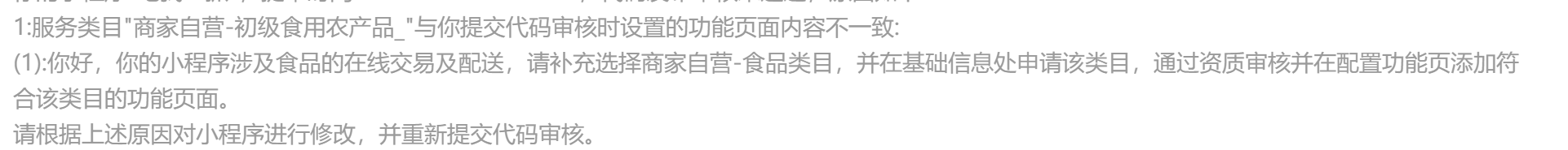 你好,经核实,贵方小程序涉及食品的在线交易及配送,需补充选择商家自营-食品类目(详图如下)