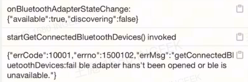 微信升级到最新版本8.0.68,关闭系统蓝牙后再开启,收到wx.onBluetoothAdapterStateChange回调后,调用wx.getConnectedBluetoothDevices报错{"errCode":10001,"errno":1500102, errMsg":"getConnectedBluetooth Devices:fail ble adapter hans't been opened or ble is unavailable."}