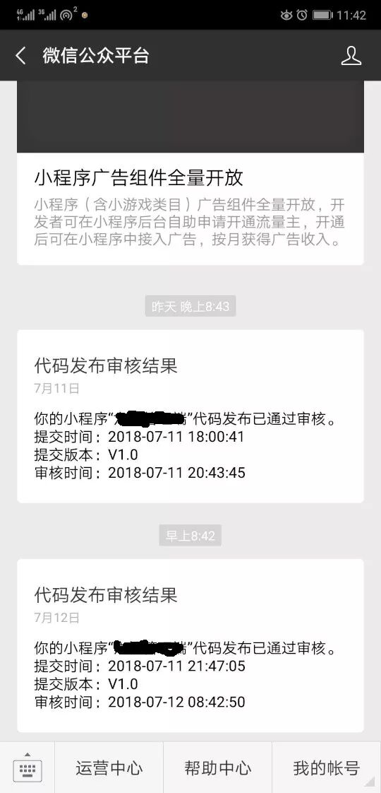 1、昨天用第三方开放平台的代码包提交审核接口(submit_audit接口)提交代码审核,接口调用成功,昨晚和今天早上各收到一次微信里公众号平台推送的通知说代码通过了审核,见下图