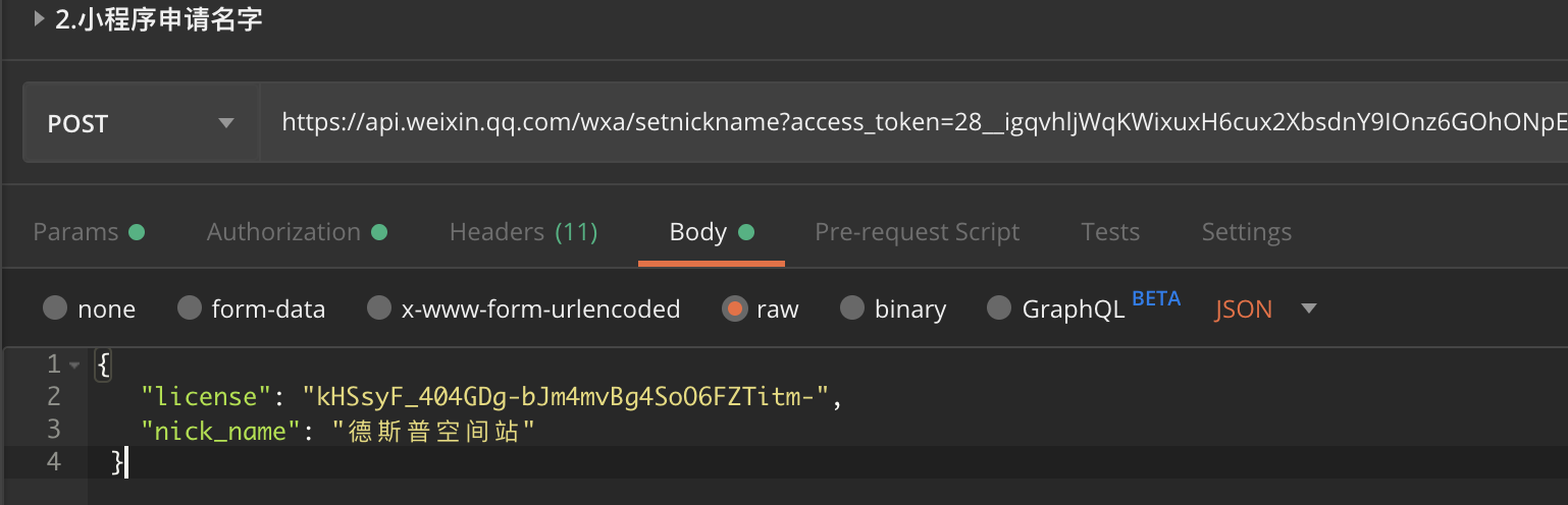 设置名称 调用本接口可以设置小程序名称,当名称没有命中关键词,则直接设置成功;当名称命中关键词,需提交证明材料,并需要审核。审核结果会向授权事件接收 URL 进行事件推送 请求地址 POST https://api.weixin.qq.com/wxa/setnickname?access_token=ACCESS_TOKEN