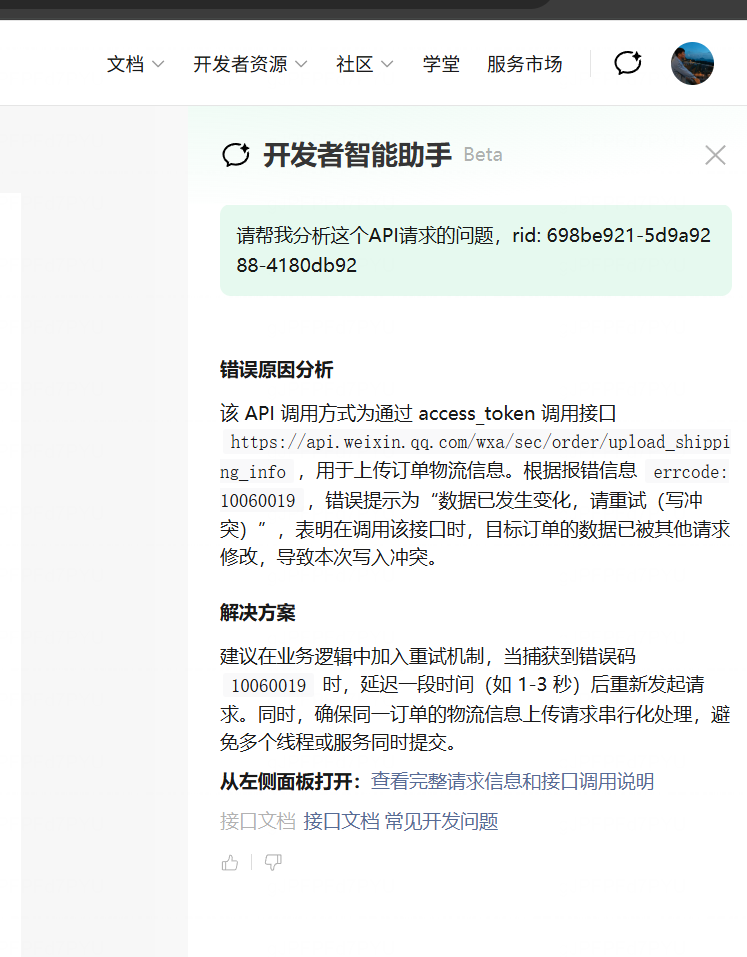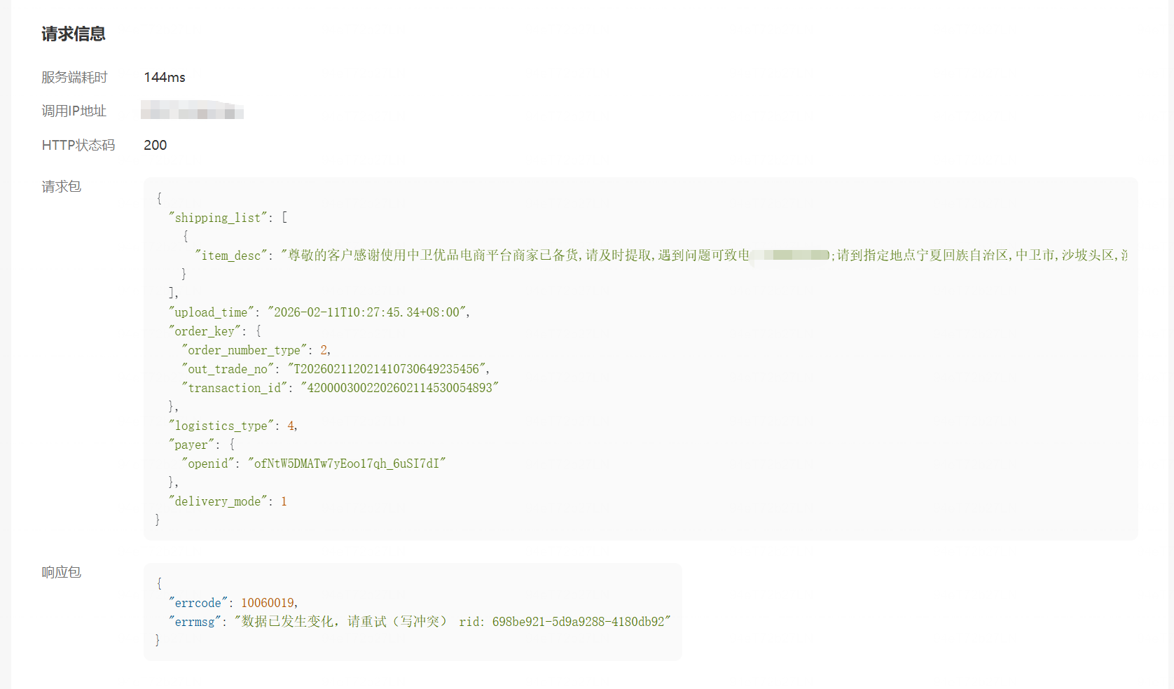 微信小程序发货接口频繁报 10060019"errmsg":"数据已发生变化 请重试(写冲突)“