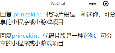 <view class="reply"> 回复 <view class="nick">princekin:</view> 代码片段是一种迷你、可分享的小程序或小游戏项目</view> |