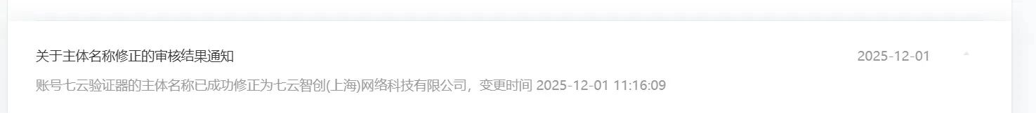 1、我司小程序主体已于2025年12月完成主体更名,变更为“七云智创(上海)网络科技有限公司”,并在贵平台提交审核后顺利通过。