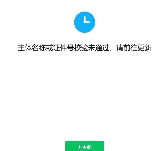 3、然而,近期我司在购买小程序用量时,系统反复弹出“主体名称或证件号校验未通过,请前往更新”的提示。我司在此期间并未进行任何主体名称、证件号或营业执照信息的变更。