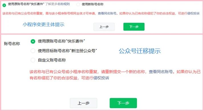 我又去公众号做迁移,又提示:该名称与已有公众号或小程序名称重复,请重新提交一个新的名称