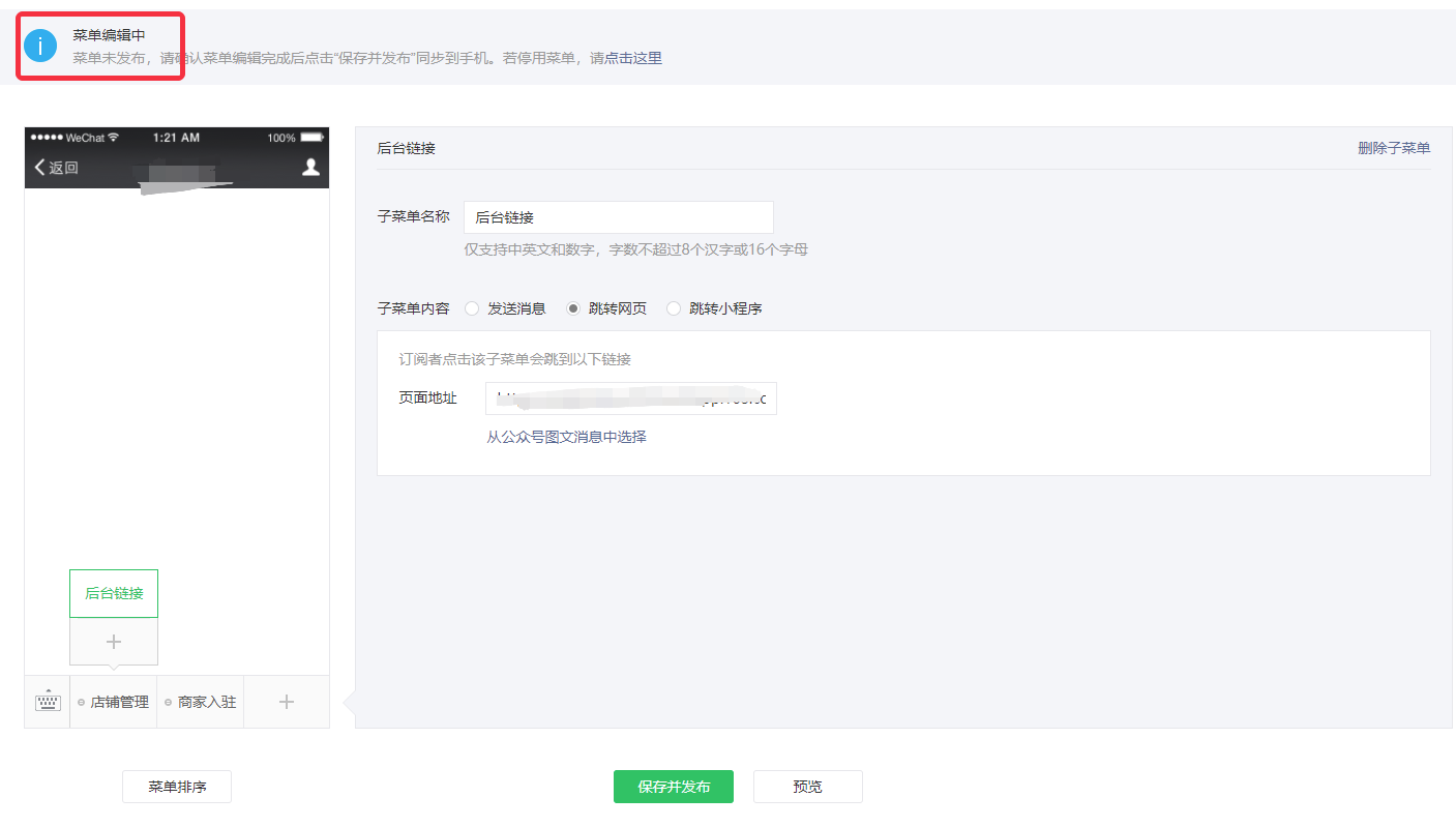 2)编辑中的菜单只要完善了菜单名称即可预览,整体发布则需要每一个菜单都完善内容,否则无法发布同步至手机端。