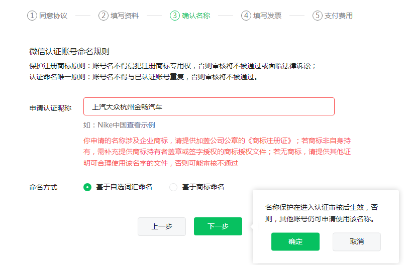 与营业执照名称相符,可以基于商标命名,然后上传营业执照即可。