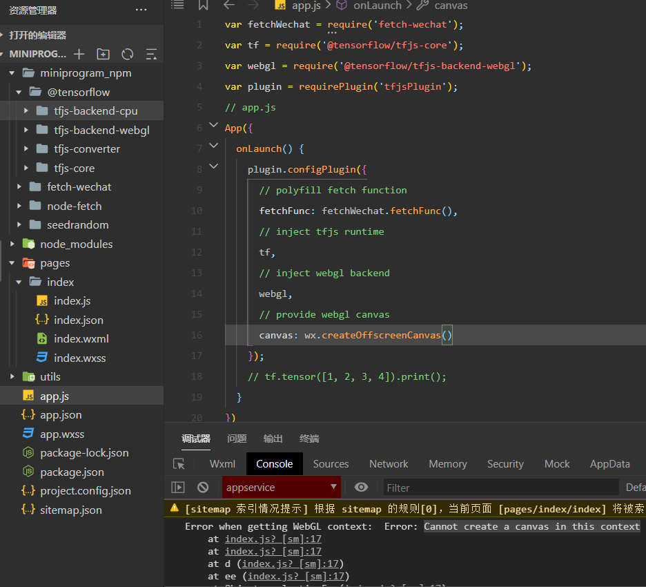根据官方文档tensorflow.js的说明走的,不明白为什么不能创建canvas对象