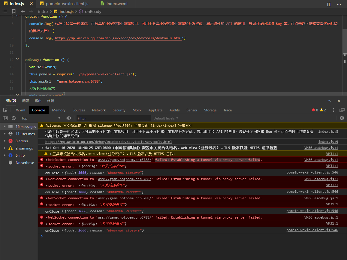 在真机调试-PC端时,onMessage只接受到一个空对象,然后整个连接过程就卡住了。如下图
