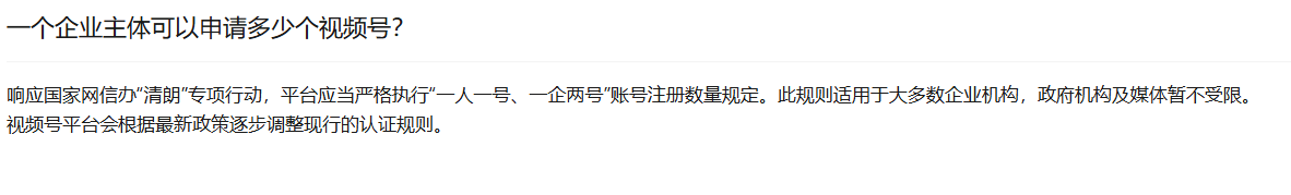 之前查到的信息说是同一个企业主体可以认证50个视频号,现在又查到是“一企两号”,到底以哪一个为准?谢谢!