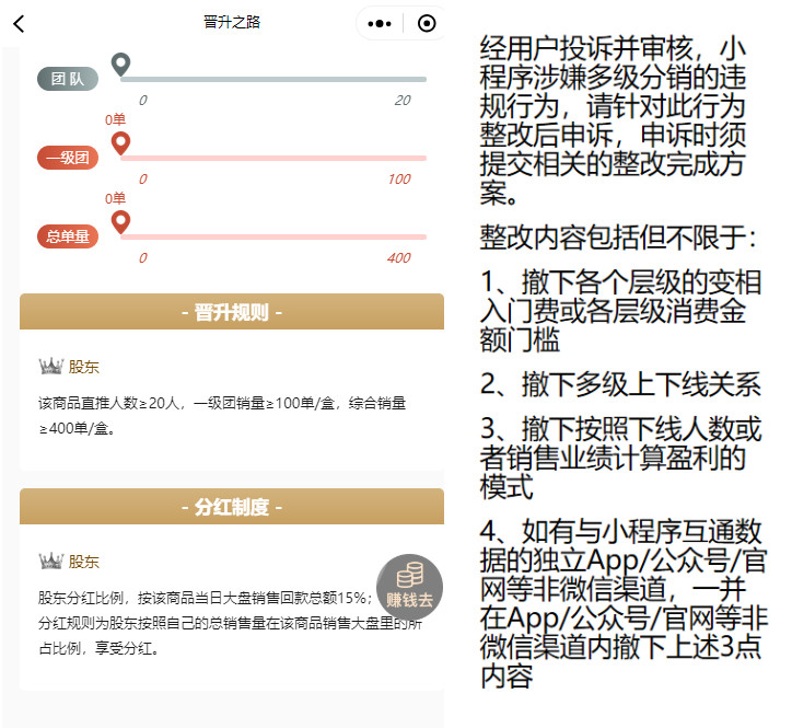你好,因用户投诉并经平台审核,你的小程序涉嫌违规分销经营行为。已违反《微信小程序平台运营规范》5.行为规范-5.9多级分销经营行为等相关规定。请立即清理存在或可能存在违反上述规定的内容。违规内容:查看详情如平台发现你在2019-09-07 12:55:16前未对违规内容进行清理,或仍然存在其他违规内容,将对你的小程序采取下架并封禁账号等处罚。清理违规内容后,请点击申诉。