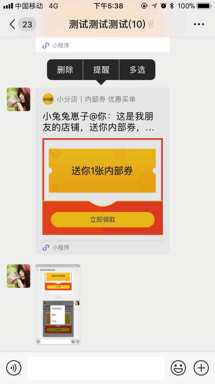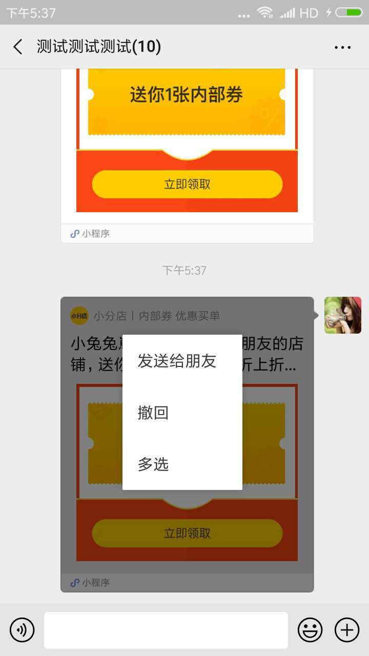 这是通过(红米3)安卓app分享转发出去的小程序卡片。再使用(红米3)(OPPO A59s )进入微信群内,长按小程序卡片,依旧可以出现“转发”按钮: