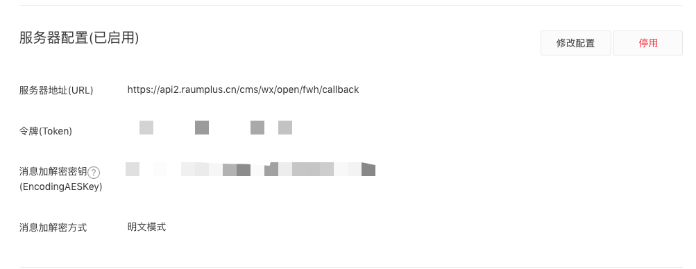 服务号也设置了后台接口地址:https://api2.raumplus.cn/cms/wx/open/fwh/callback