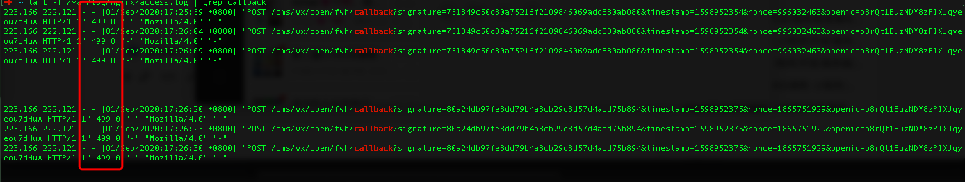 223.166.222.121 - - [01/Sep/2020:17:26:30 +0800] "POST /cms/wx/open/fwh/callback?signature=80a24db97fe3dd79b4a3cb29c8d57d4add75b894×tamp=1598952375&nonce=1865751929&openid=o8rQt1EuzNDY8zPIXJqyeou7dHuA HTTP/1.1" 499 0 "-" "Mozilla/4.0" "-"