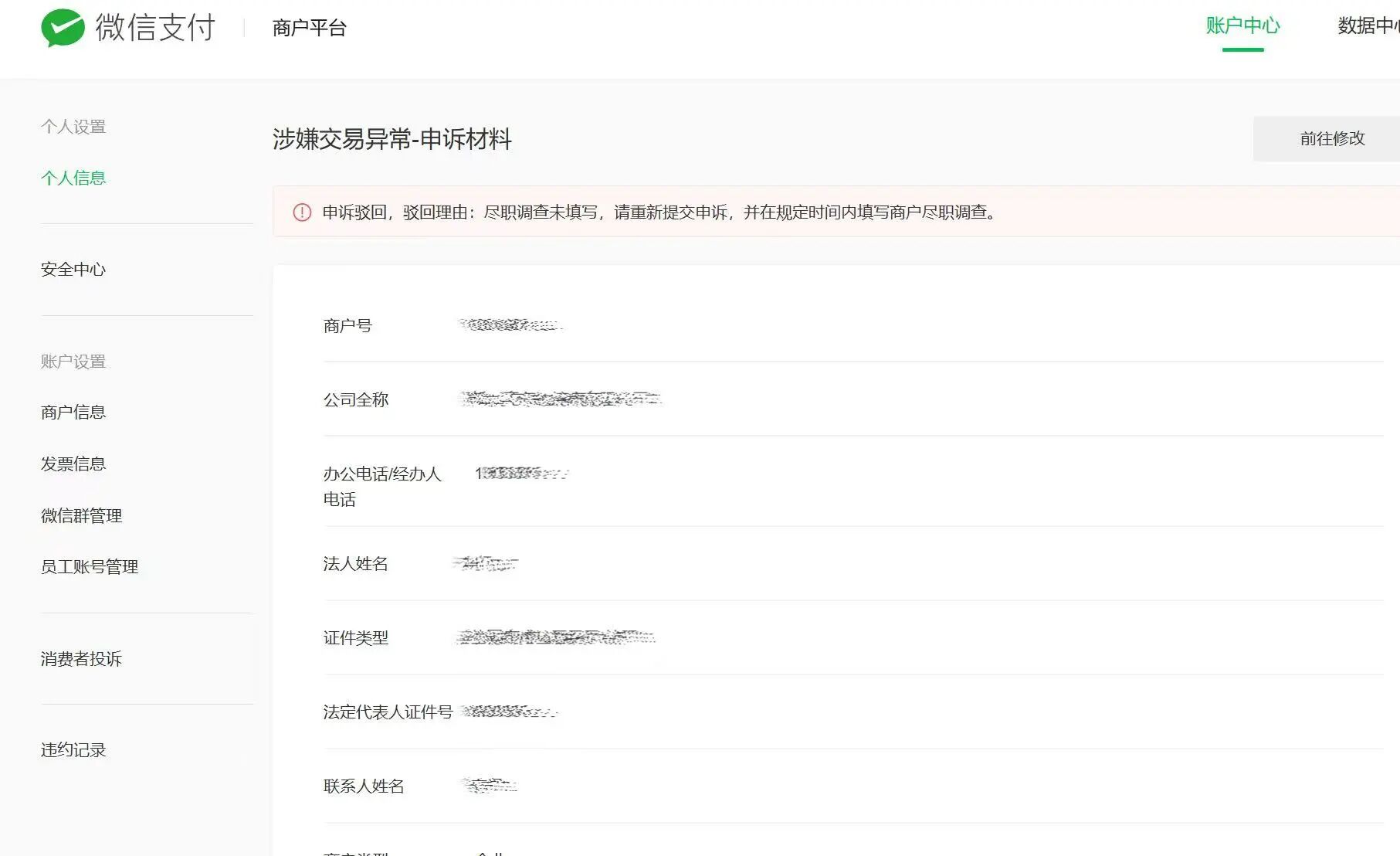 哈喽 想问下你这边解决了吗?我这边也遇到同样的情况,反反复复提交驳回操作了一年了,每次驳回的理由都是未完成尽职调查,但是我们同样的都有在小程序或者 pc 端后台处理 想问下你这边最后结果是怎么样的