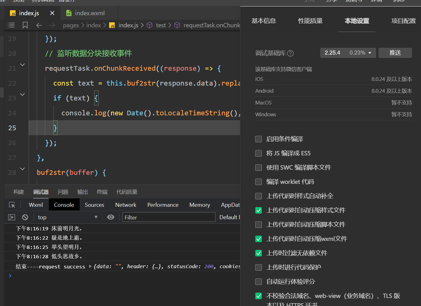 wx.request()已经设置了enableChunked:true,但是实际收到的结果是这样的,结果是分段的,但是确实一次性返回:
