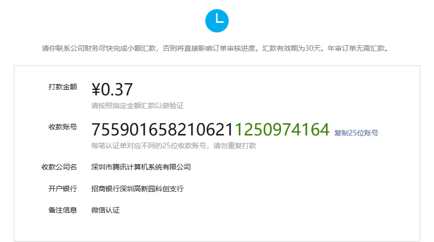 微信认证订单显示需要小额汇款才能完成认证,但是结尾又说年审订单无需汇款,但是又附上了汇款账户信息,存在误导消费者的嫌疑,自相矛盾。请告知是否需要小额汇款。